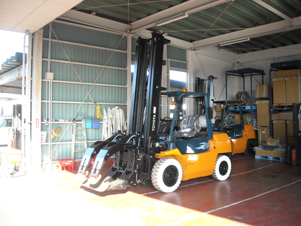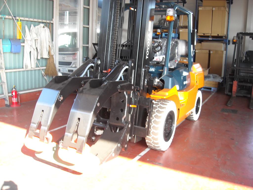 こちらは、「ロールクランプ」というアタッチメント付きのフォークリフトです。その名のとおり、「ロール(紙)」を「クランプ(掴む)」するのです。