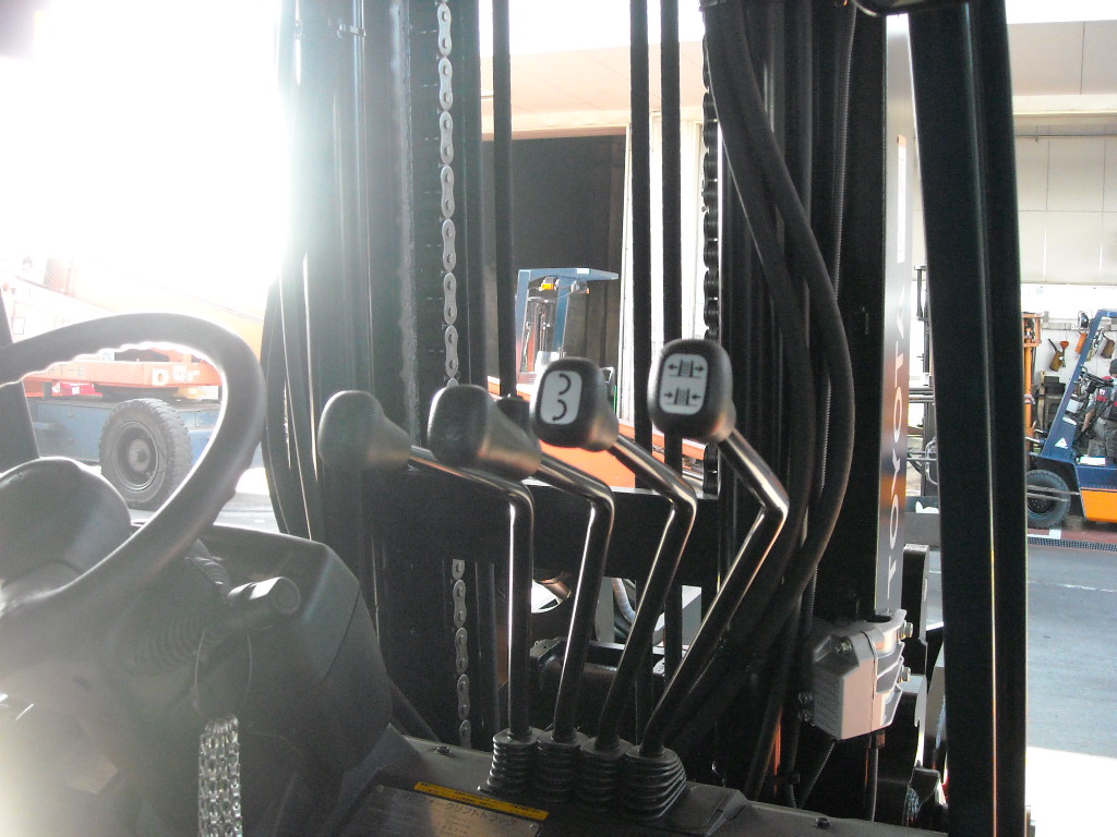 製紙業、紙加工業のお客様現場で使用されるリフトで、パレットを用いずに直接ロール原反をつかみ、回転させて機械へ投入したり、はい付けをしたりします。そのため、掴む、離す、右回転、左回転の4つのレバーが付いているというわけです。