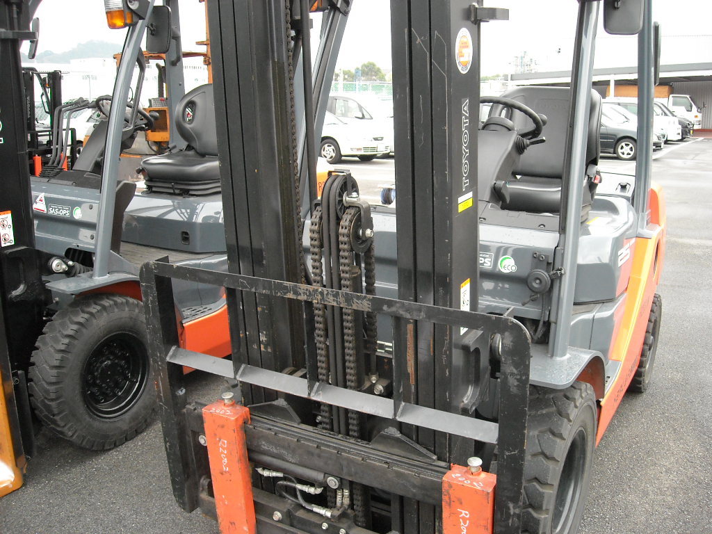 これに対して、FSVマストでは、ツメを上げるためのシリンダーが別に付いているため、ツメを上げる操作をすると、内側マストが上がる前に、ツメが外側マストの高さまで上がりきります。天井の低い倉庫で荷物を2段積みしたいときや、倉庫入口が低く、通常のフォークリフトでは作業に支障があるといったお客様に多くご使用いただいています。天井にマストをぶつけてしまう、気を遣って作業をしているといった問題を解決できます。この写真は当社のレンタル車です。レンタル、デモが可能ですので、ぜひお申し付けください!
